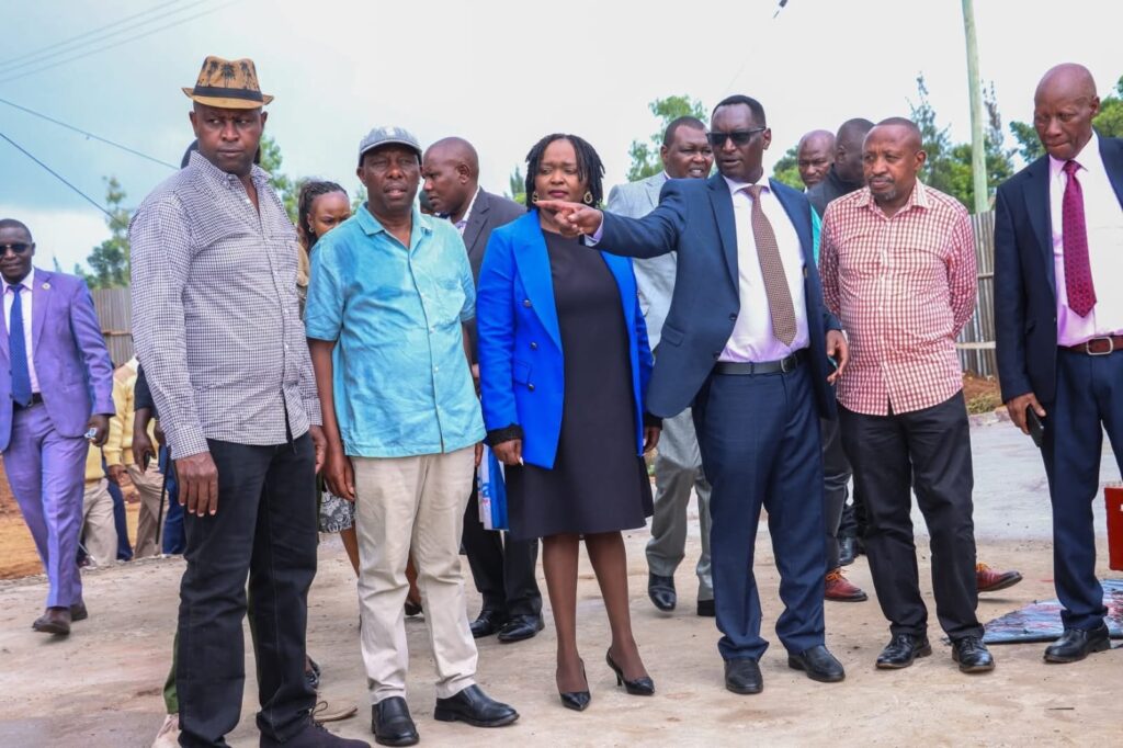 Meru Dairy Cooperative Union CEO Kenneth Gitonga (in glasses) accompanied by PSs Kiburi Kilemi, Gitonga Mugambi and other leaders at the milling plant’s site